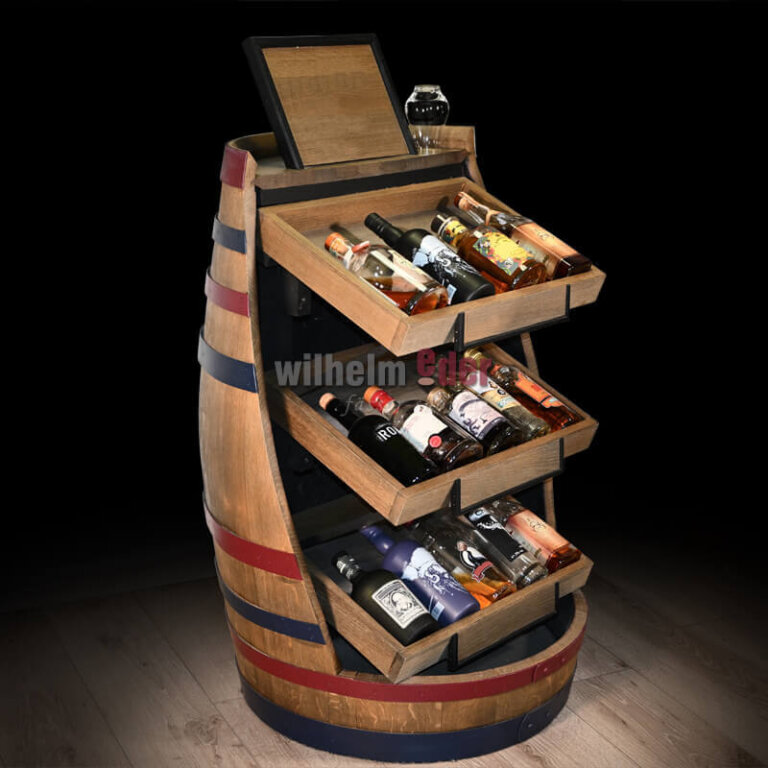 The barrel table was built according to customer specifications from a 300 l wooden barrel and a thermobox was integrated to fit perfectly.