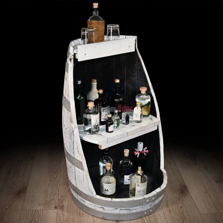 A barrel of approx. 200 l is cut open diagonally from top to bottom. . A special exterior treatment of the barrel wood with white lacquer (white limed look, “shabby”) completes the exclusive look of the display.