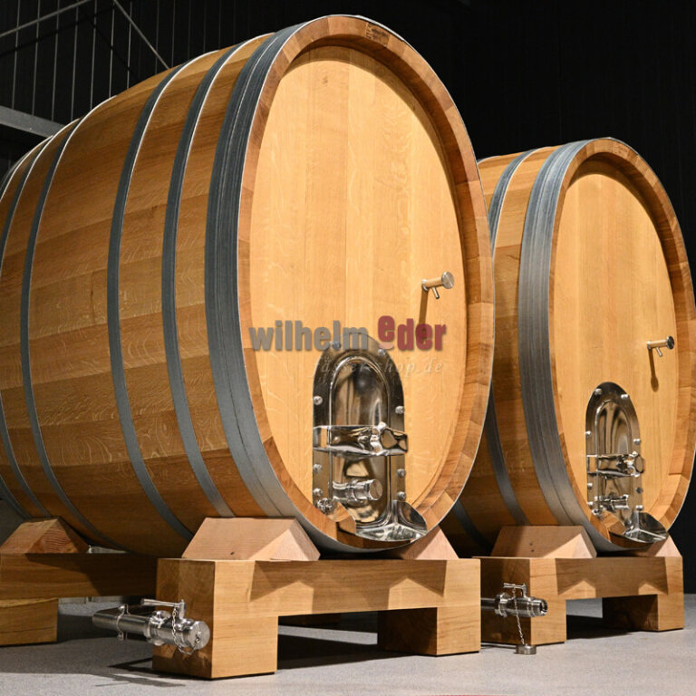 Round large casks/vats produced to customer order, made from seasoned oak wood, origin Palatinate Forest / Northern Vosges.